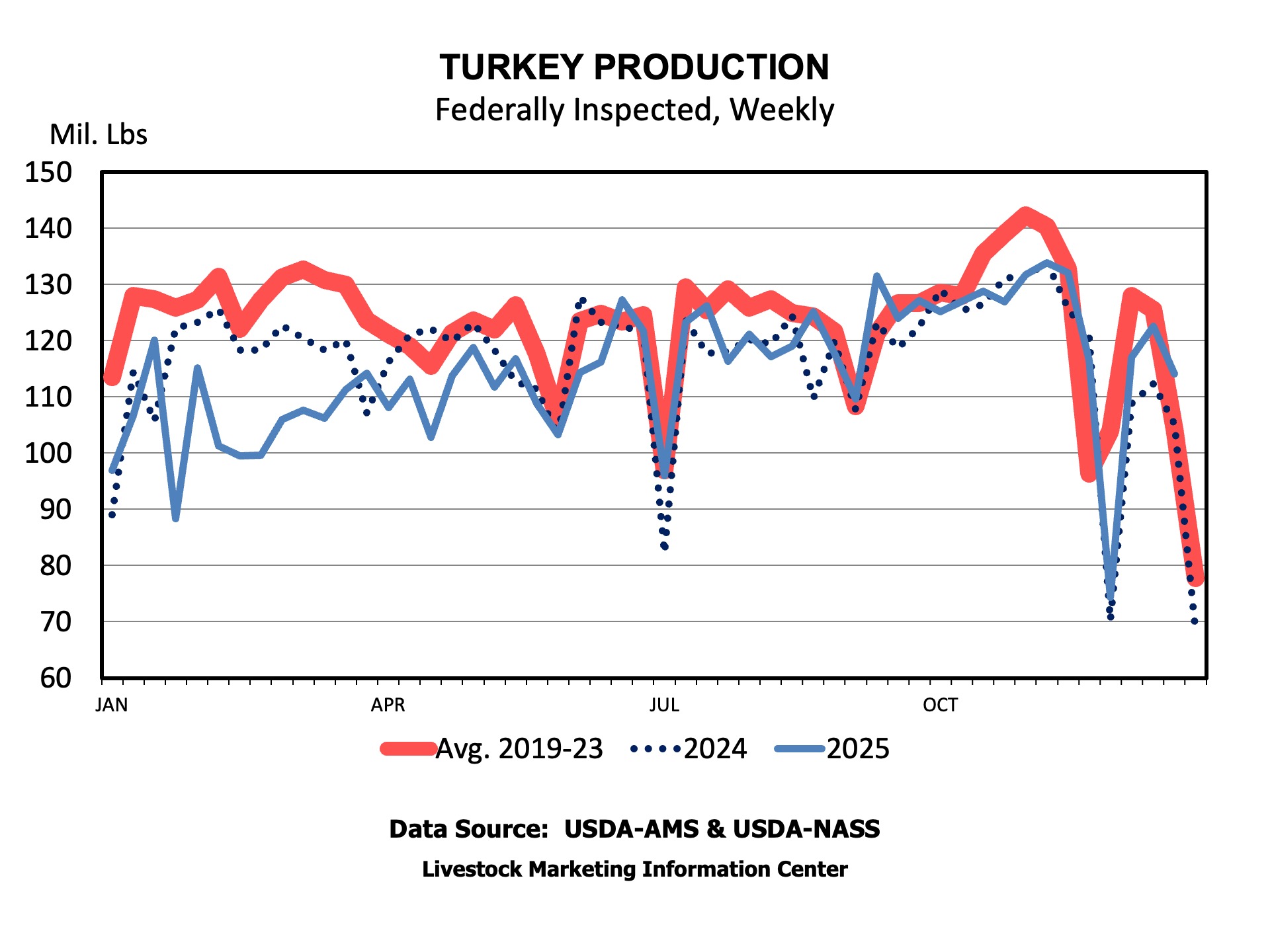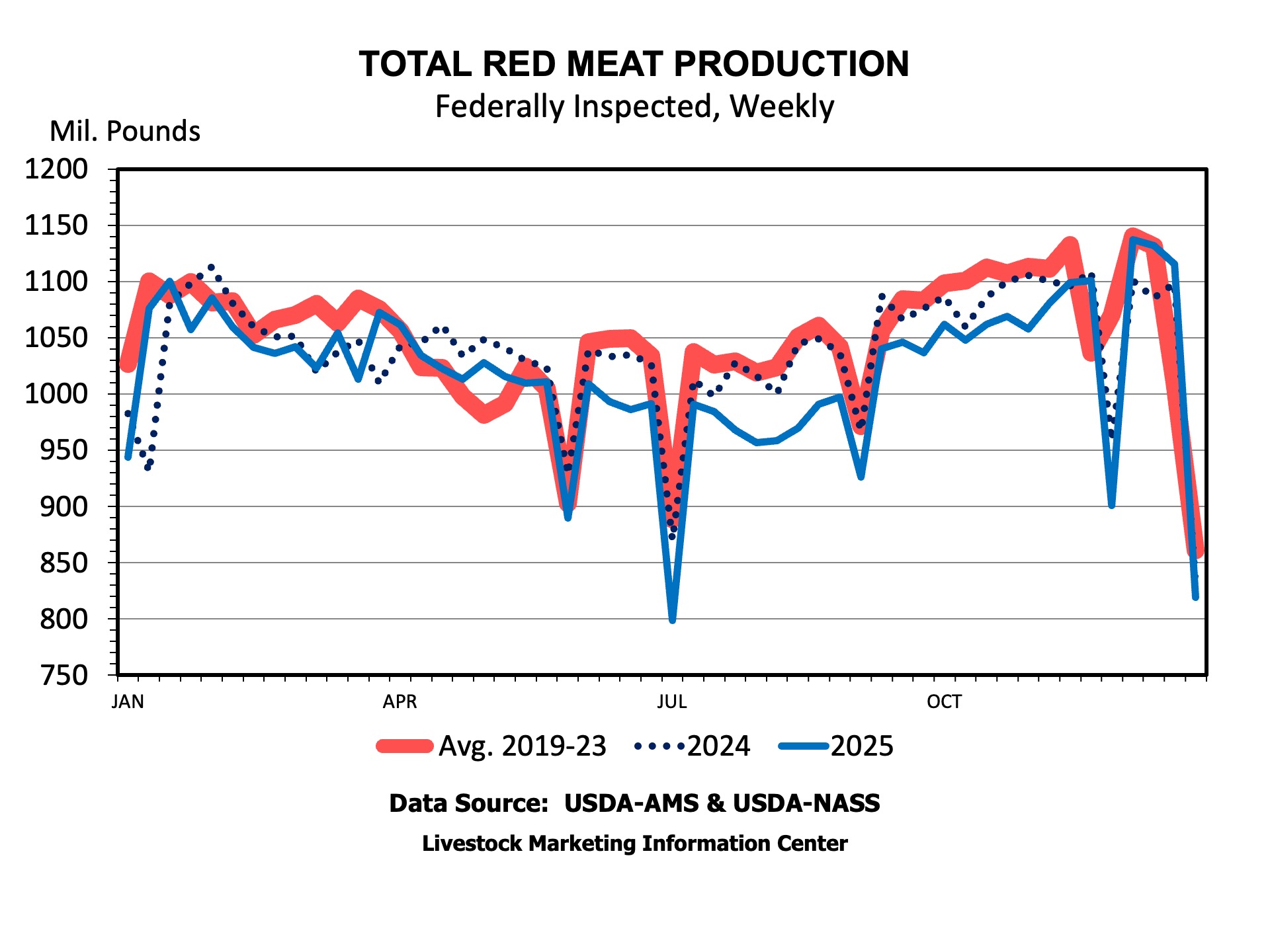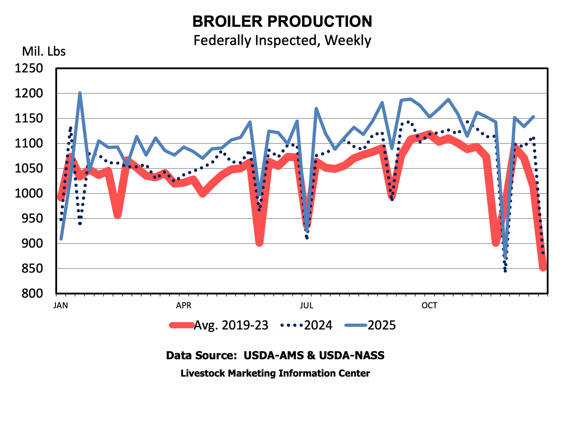For the year, 3.5 percent (1.9 billion pounds) more broiler meat was produced than in 2024. Turkey production was down about 122 million pounds. On balance, increasing poultry production offset declining red meat production, leading to an increase in total meat production of about 800 million pounds.