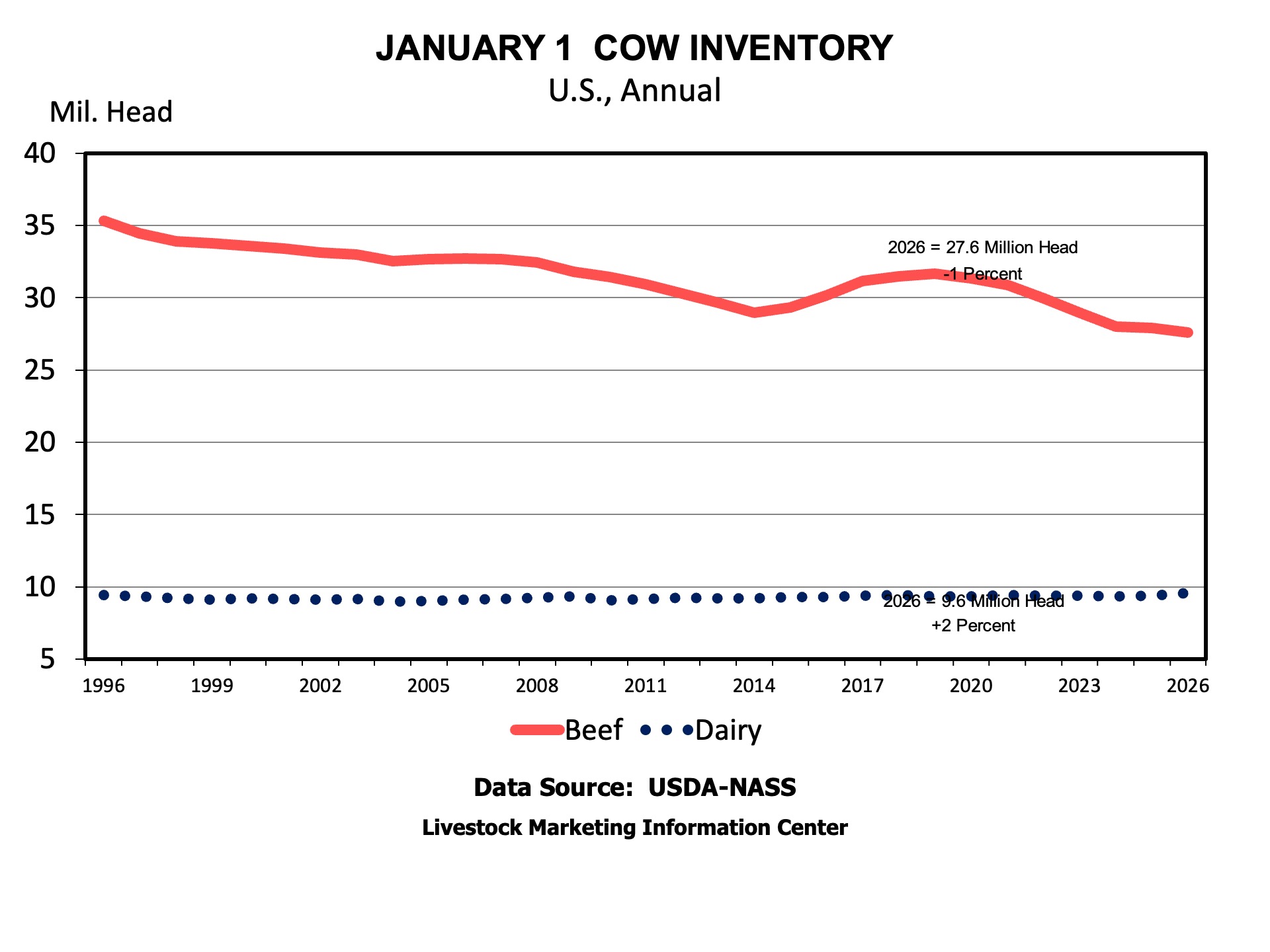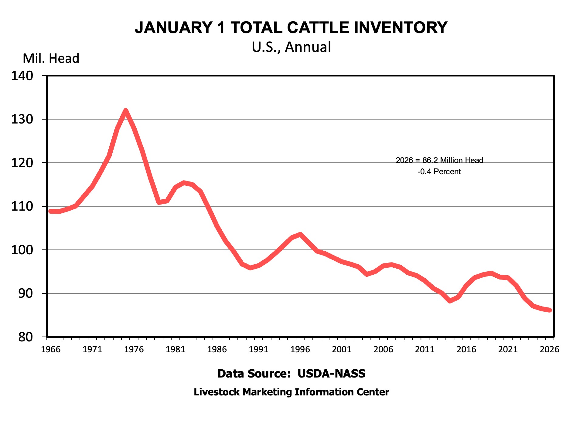 In a word – bullish! The 1% decrease in beef cow inventory surprised me. With beef cow slaughter down by over 500,000 head in 2025, I expected beef cow numbers to be up slightly coming into 2026. At 27.6 million cows, the US beef herd is still at its lowest level since 1961.
